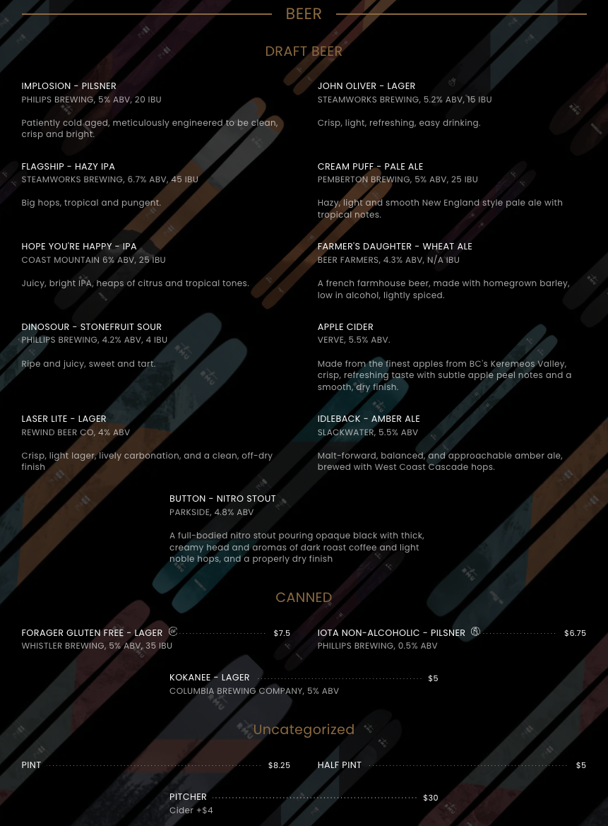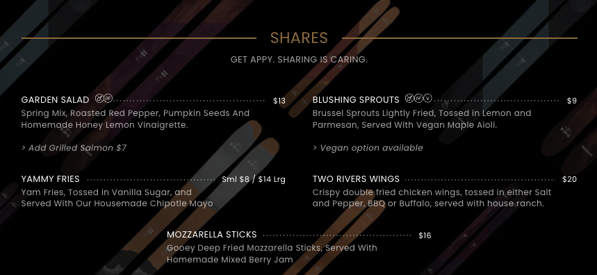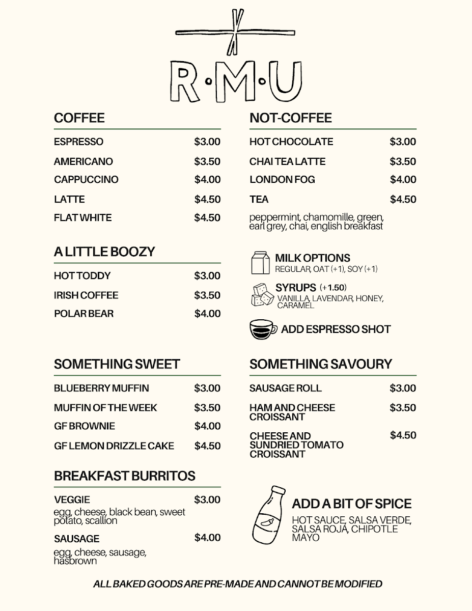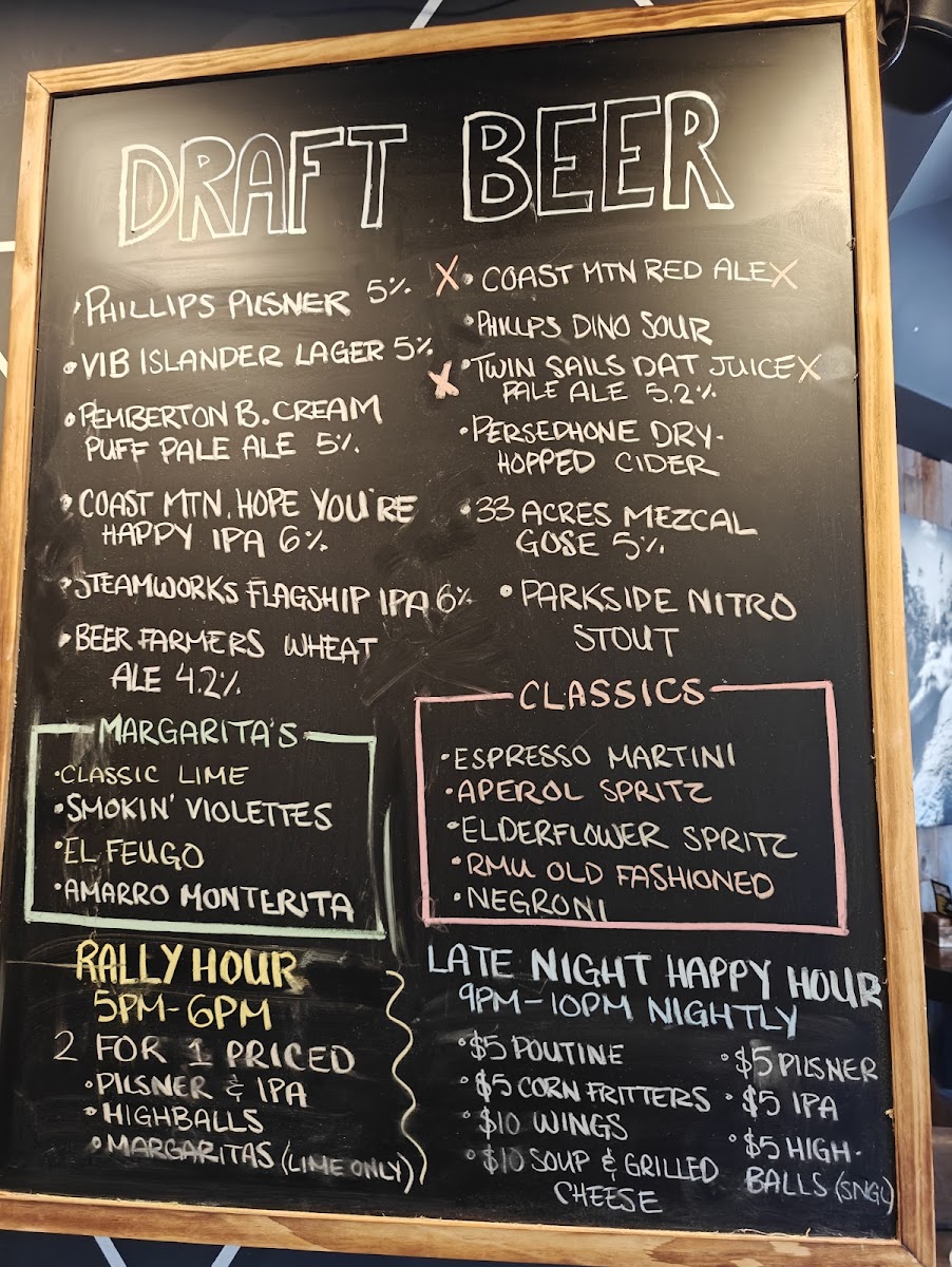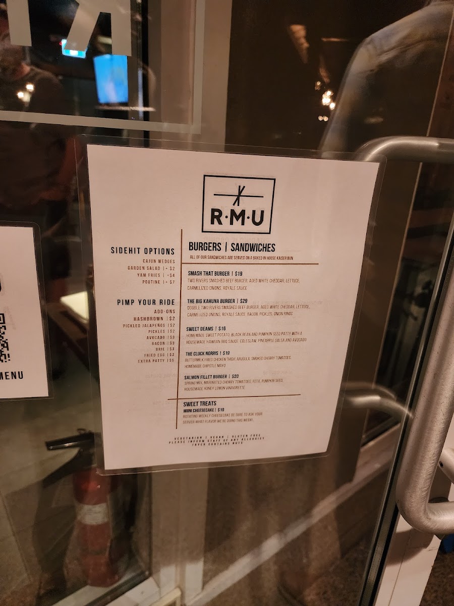 From the reviewer’s perspective, Rmu Whistler offers a menu that effortlessly balances comfort and creativity. For morning pick-me-ups, guests can choose from classic coffees like Espresso, Americano, Cappuccino, Latte, and Flat White, or venture into warm alternatives with Hot Chocolate, Chai Tea Latte, and the aromatic London Fog Tea. For those seeking a spirited start, the Hot Toddy, Irish Coffee, and Polar Bear add a playful twist. Sweet treats are abundant, from the seasonal Muffin of the Week and Blueberry Muffin to indulgent options like the GF Brownie and Chocolate Croissant, while savory cravings are met with Sausage Roll, Ham and Cheese Croissant, and Cheese and Sundried Tomato Croissant. Brunch and lunch options impress with Breakfast Burritos in Veggie or Sausage varieties, and lighter fare like Garden Salad, Green Goddess Bowl, and the whimsically named I Pita the Fool. For sharable plates, the menu features Blushing Sprouts, Yammy Fries, Two Rivers Wings, and classic Mozzarella Sticks alongside another Garden Salad. Burger enthusiasts are well-catered for, with standout offerings such as Royale with Cheese, Smash That Burger, Salmon Fillet Burger, The Cluck Norris 2.0, and Sweet Dreams, each customizable with add-ons like Brie, Thick Cut Two Rivers Bacon, Fried Egg, Pickles, or Pickled Jalapeños, paired with sides like Garden Salad or Yam Fries. Drink options complement the menu beautifully, with draft beers like Implosion - Pilsner, John Oliver - Lager, Flagship - Hazy IPA, Cream Puff - Pale Ale, and Hope You’re Happy - IPA, as well as canned selections including Forager Gluten Free - Lager, Iota Non-Alcoholic - Pilsner, and the familiar Kokanee - Lager. Overall, the menu at Rmu Whistler is an inviting mix of classic comfort, playful innovation, and thoughtful variety, appealing to locals and visitors alike.