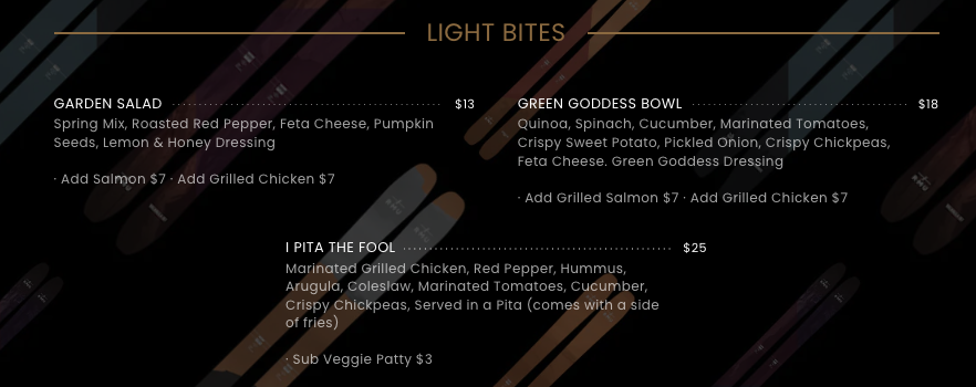 Quinoa, Spinach, Cucumber, Marinated Tomatoes, Crispy Sweet Potato, Pickled Onion, Crispy Chickpeas, Feta Cheese. Green Goddess Dressing
